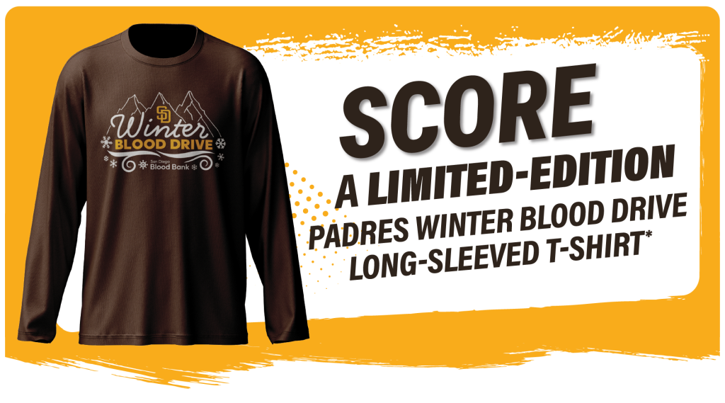 One Week Only! Get a Limited-Edition Padres Blood Drive Winter T-Shirt* when you donate blood from January 26-31, 2026. Winter is the perfect time to be a hometown hero.Donate blood at any San Diego Blood Bank donor center or mobile blood drive and score an exclusive 2026 Padres Winter
