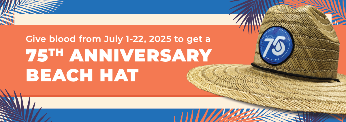 As a special appreciation gift for blood donors July 1 – 22, all donors will receive an exclusive 75th Anniversary Beach Hat*, while supplies last.