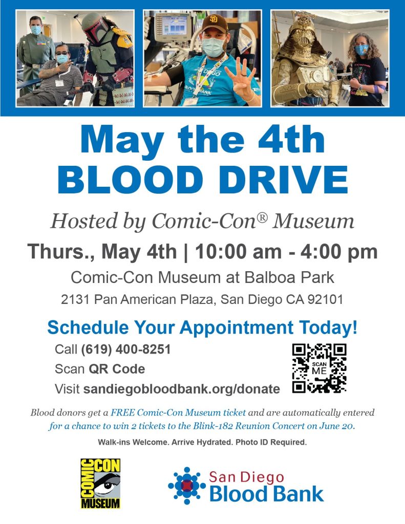 Join San Diego Blood Bank and the Comic-Con Museum for the May the Fourth Be With You Blood Drive. Together, we must harness the Force within to help our community through blood donation! Did you know that a single blood donation can help impact the lives of up to 3 local people?