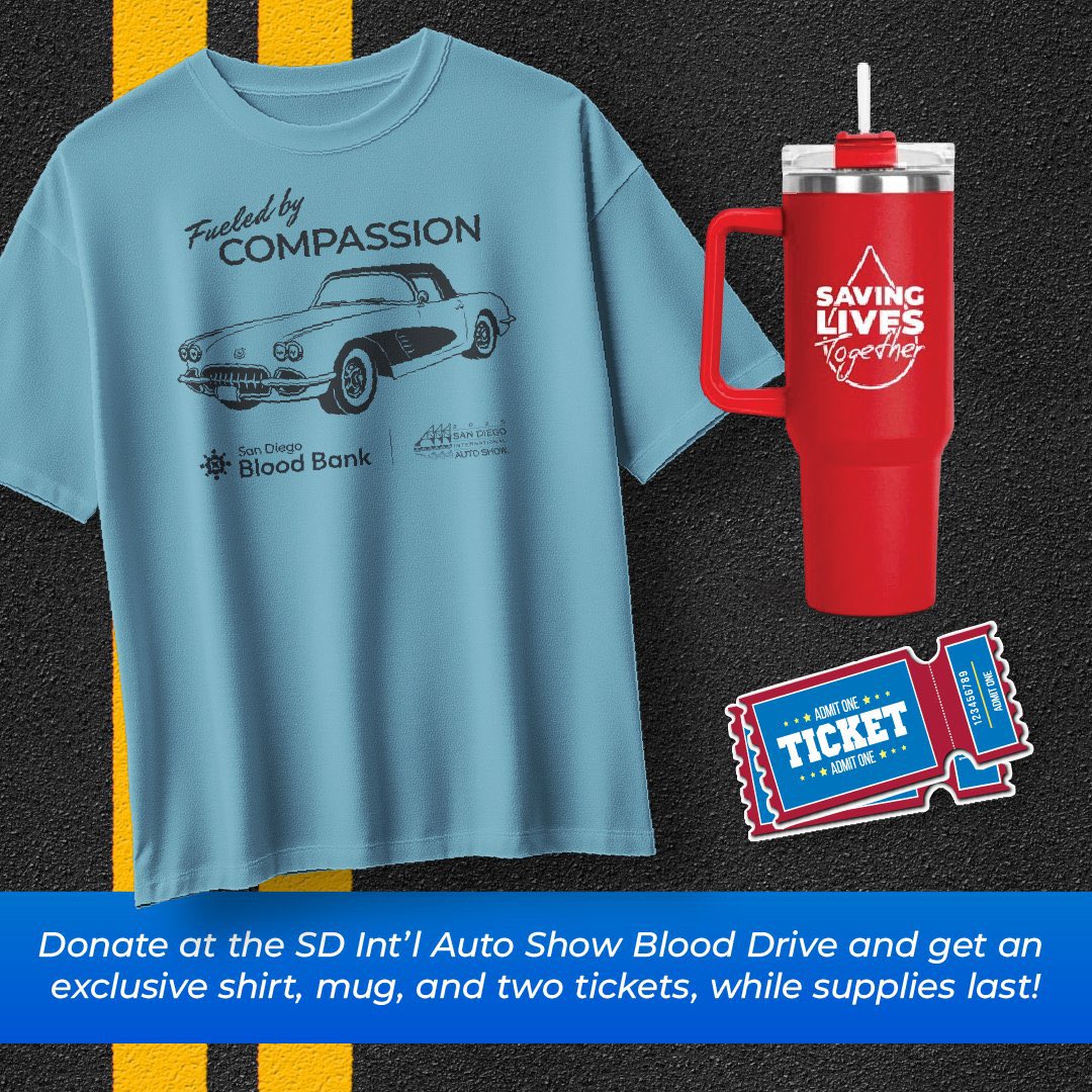 - a limited-edition San Diego Auto Show Blood Drive T-shirt (while supplies last),