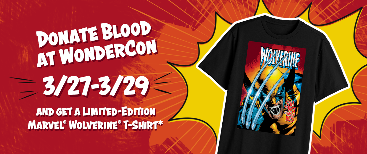 Donate blood during WonderCon® and get a limited-edition Wolverine T-shirt*.