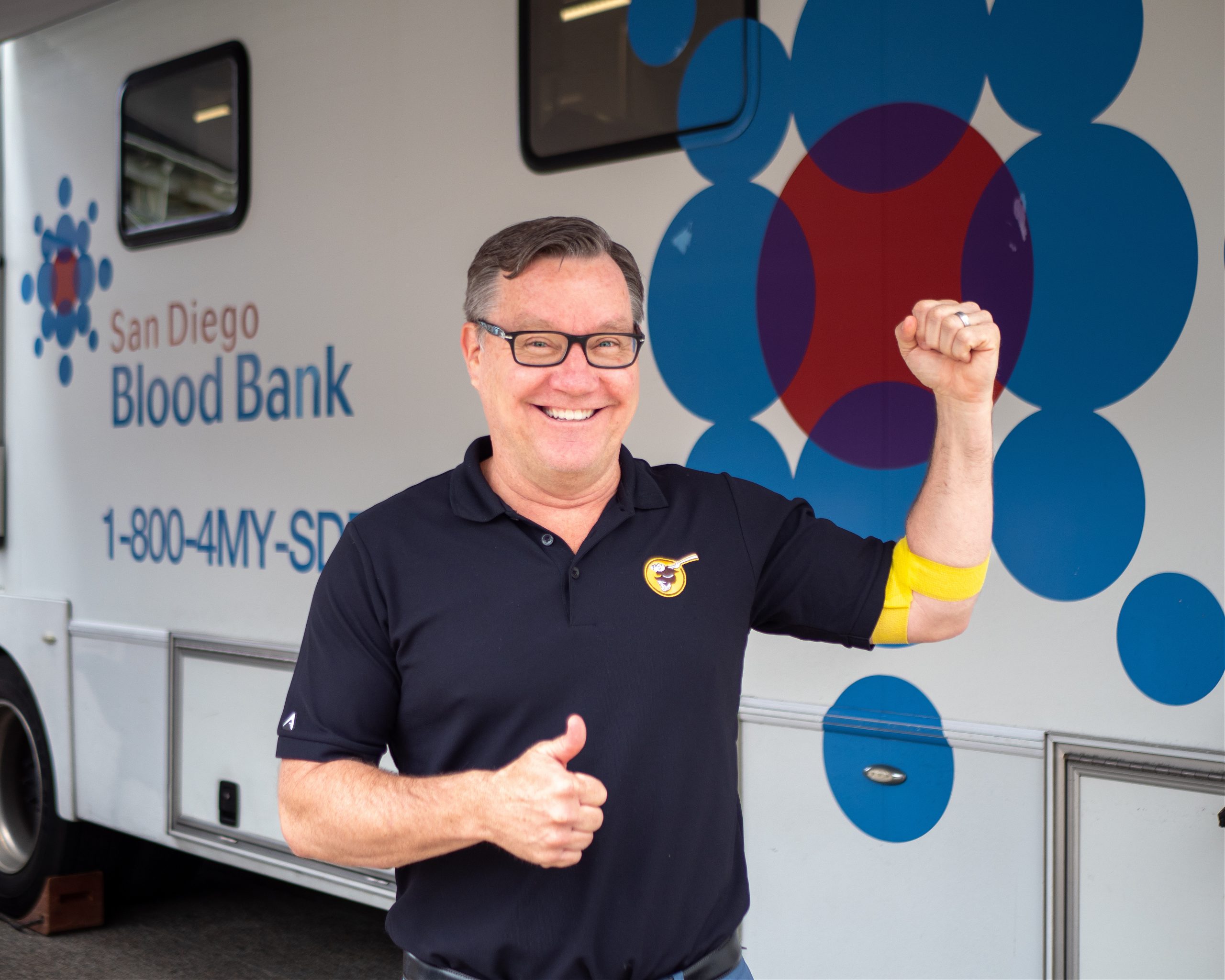 (Photo Caption: Tom Seidler, Padres Sr. VP of Community and Military Affairs, proudly showcases his post-blood donation armband at the 7th Annual Padres Summer Blood Drive on May 31, 2023.)