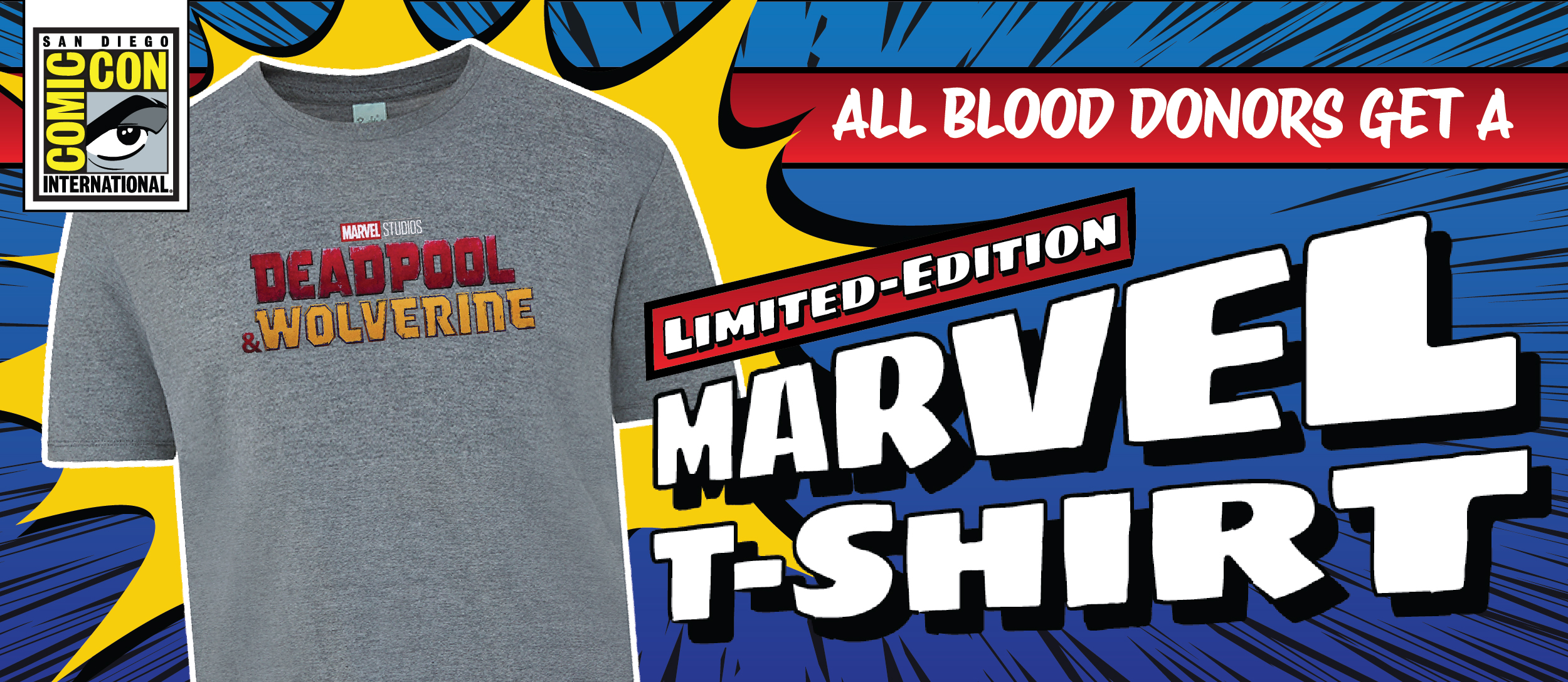 Want to celebrate with us and help save MORE lives? Give blood July 29, 2024, through August 31, 2024, and receive a limited-edition Marvel Deadpool & Wolverine T-shirt*.