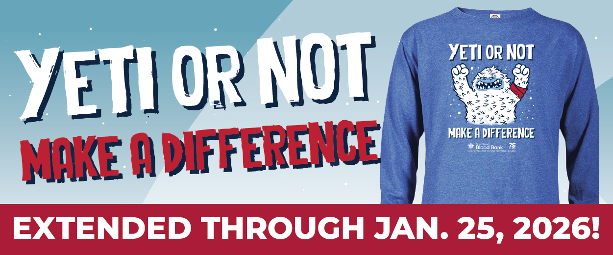 EXTENDED DUE TO POPULAR DEMAND! Donate blood with us through January 25, 2026, and get a “Yeti or Not, Make a Difference” long-sleeve t-shirt, while sizes and supplies last!*